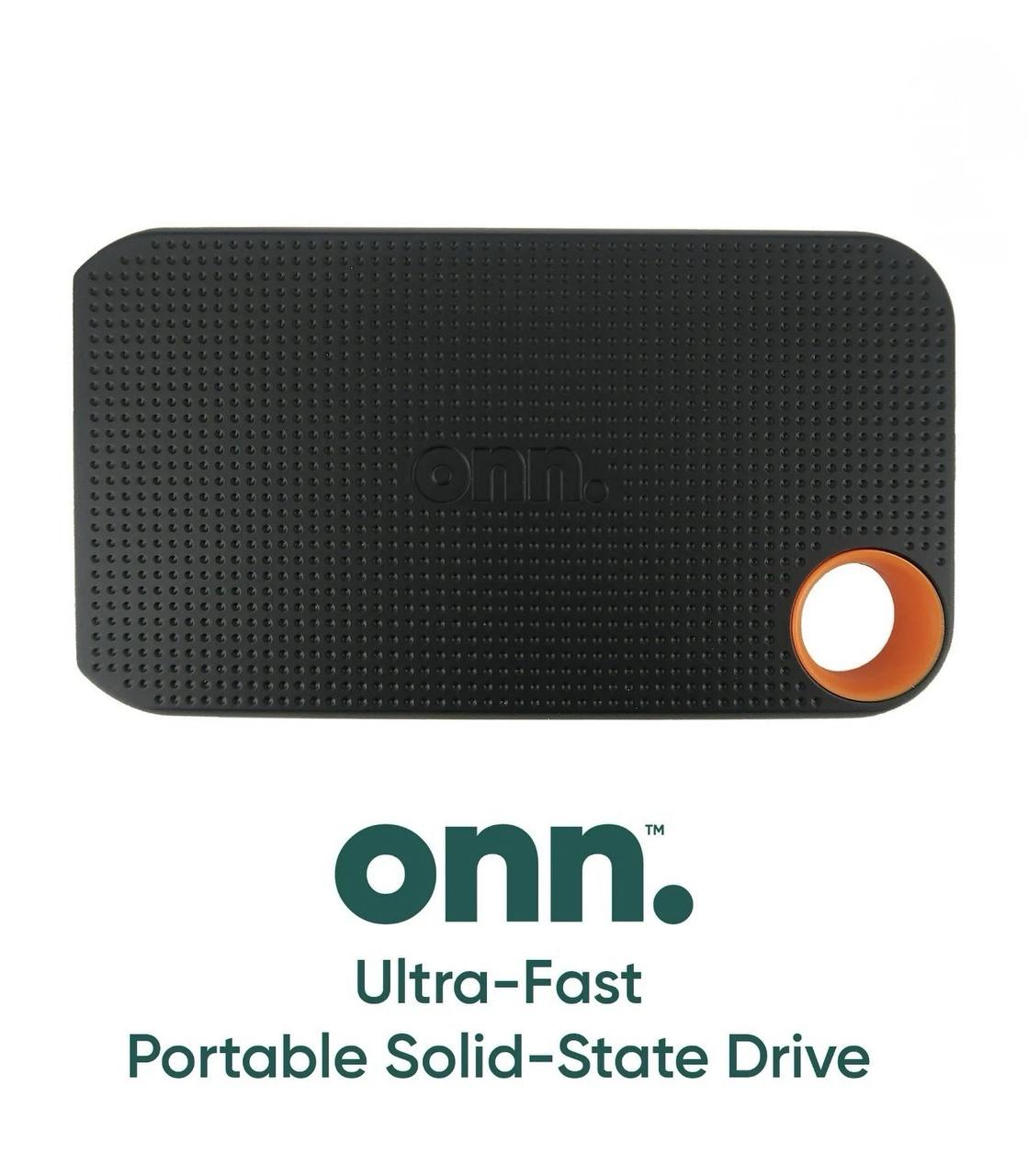 The onn. 500GB Ultra-Fast External Portable Solid-State Drive is a compact storage solution that offers 500GB of capacity, allowing users to store up to 128,000 12MP photos or 42 hours of HD video recording. It is compatible with Windows, Mac, and Chromebook devices and comes with a USB-C cable and case. The drive boasts fast read and write speeds of up to 2000 MB/s and 1900 MB/s, respectively, and is drop-tested to 3.3 ft. It includes a USB-C to USB-C cable, a USB-C to USB cable, and a hard case. With its fast speeds and compact design, this drive is ideal for expanding storage capabilities and storing valuable data on-the-go.